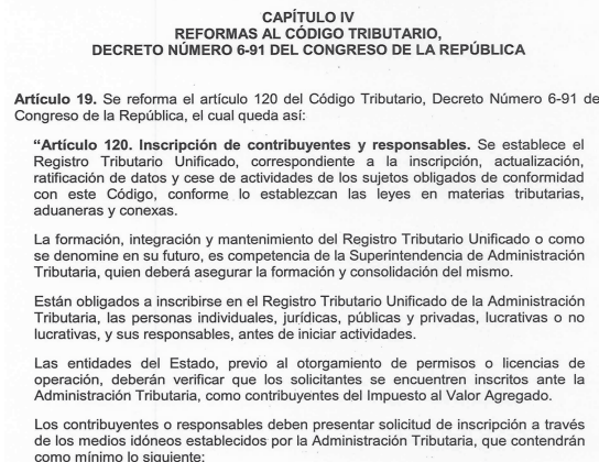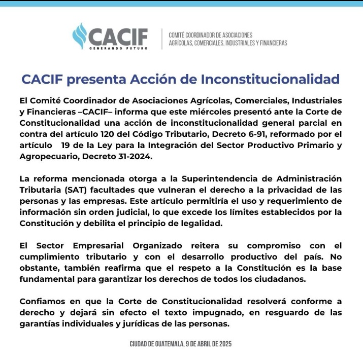 El Comité Coordinador de Asociaciones Agrícolas, Comerciales, Industriales y Financieras (CACIF) presentó una acción de inconstitucionalidad contra el artículo 120 reformado del Código Tributario, contenido en el Decreto 31-2024. Este artículo establece nuevas obligaciones de inscripción, actualización y ratificación de datos para contribuyentes, bajo la administración de la Superintendencia de Administración Tributaria (SAT).