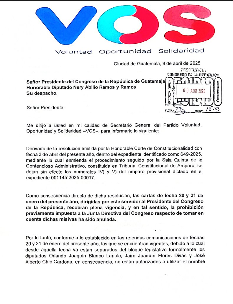 La división interna del partido Voluntad, Oportunidad y Solidaridad (VOS) llegó a un nuevo punto de tensión. A través de una carta enviada al presidente del Congreso, Nery Ramos, el Secretario General de VOS, Carlos Manuel Bezares Marroquín, reiteró la separación de los diputados Orlando Blanco, Jairo Flores y José Chic del bloque legislativo. No obstante, su expulsión aún no es oficial, ya que debe ser reconocida formalmente por la Junta Directiva del Congreso.