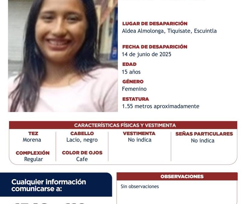 Briana Alexandra Ajpop García, de 15 años, fue reportada como desaparecida el sábado 14 de junio de 2025 en la aldea Almolonga, Tiquisate, Escuintla. Las autoridades […]