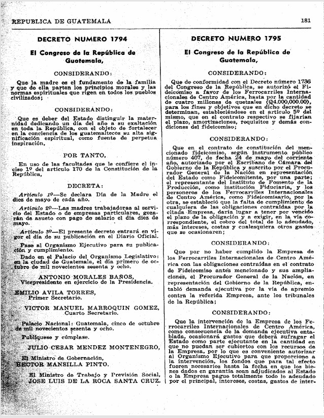 Fue en el año 1,968 durante el gobierno de Julio César Méndez Montenegro, que en Guatemala se incorporó oficialmente la celebración del Día de la Madre. En ese año para el 1 de octubre fue aprobado el decreto 1794, en el cual se establece un día de asueto con goce de salario el 10 de mayo de cada año para las madres que trabajan en el estado o en empresas privadas.