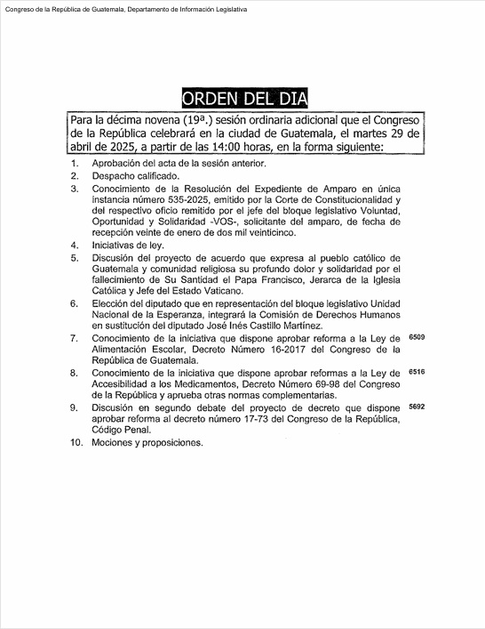 Entre los temas aprobados para discusión están el homenaje por el fallecimiento del papa Francisco, la elección de un nuevo representante de la UNE en la Comisión de Derechos Humanos y el conocimiento de amparos relacionados con cambios en la Junta Directiva. Sin embargo, no se abordará el polémico aumento salarial que desató fuertes críticas en semanas recientes.