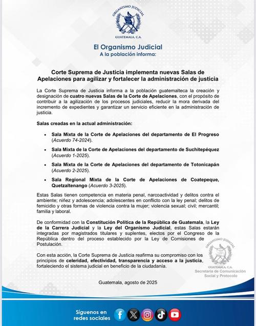 Este anuncio se dio el pasado 27 de agosto, a través de un comunicado se leía que las nuevas instancias serán para “agilizar y fortalecer la administración de justicia”. Estas salas estarán ubicadas en El Progreso, Totonicapán, Suchitepéquez y Coatepeque.