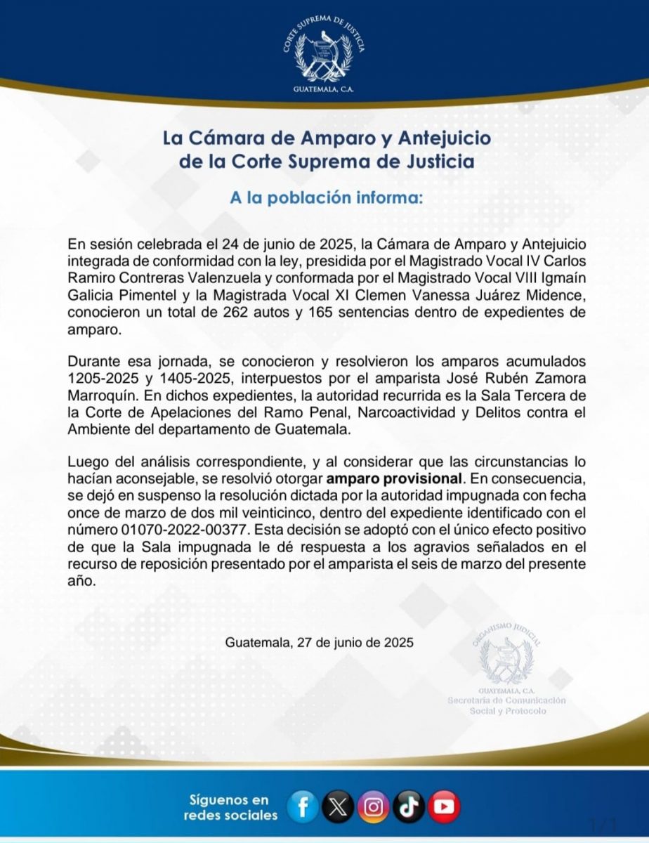 La Cámara de Amparo y Antejuicio de la Corte Suprema de Justicia (CSJ) ha concedido un amparo provisional al periodista José Rubén Zamora. Aunque este amparo no dicta la libertad de Zamora, sí ordena a la Sala Tercer de Apelaciones revisar y fundamentar la decisión en la que declaró de oficio «actividad procesal defectuosa».