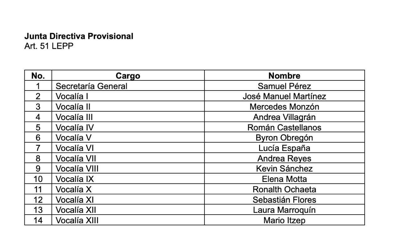 Durante el evento se presentó la Junta Directiva Provisional. Samuel Pérez fue nombrado secretario general. También la integran los diputados Andrea Villagrán, Mercedes Monzón, Román Castellanos y Byron Obregón como vocales.