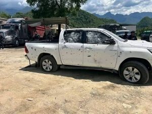 En las imágenes compartidas por pobladores, se observa una discusión entre hombres armados vestidos de civil, seguida por un choque entre vehículos y un intercambio de disparos. También se identifica una patrulla de la PNC, con número HUE-111, estacionada en el área sin que se evidencie intervención policial.