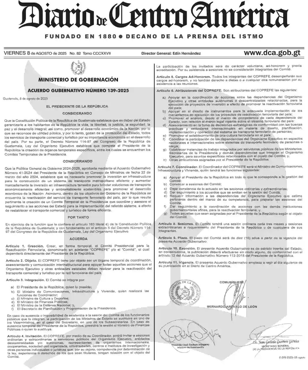 agosto 12, 2025El Gobierno de la República estableció mediante el Acuerdo Gubernativo 139-2025, el Comité Presidencial para la Reactivación Ferroviaria (COPREFE), este será un órgano de coordinación que dependerá directamente del presidente de la República y buscará viabilizar proyectos de transporte ferroviario comercial y turístico.