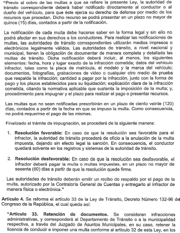 El 22 de noviembre del 2024 fue aprobada por el Congreso de la República, la ley permite a los conductores impugnar sanciones económicas, otorgándoles la posibilidad de obtener resoluciones favorables o desfavorables. Además, establece que las multas no notificadas en un plazo de 120 días serán consideradas prescritas, eliminando la obligación de pago en esos casos. Esta normativa sigue enfrentando un sinfín de críticas sobre su implementación y efectividad.