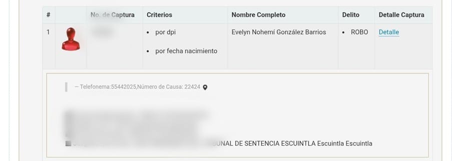En la consulta le aparece una orden de captura pendiente por el delito de robo. Fuente: PNC.