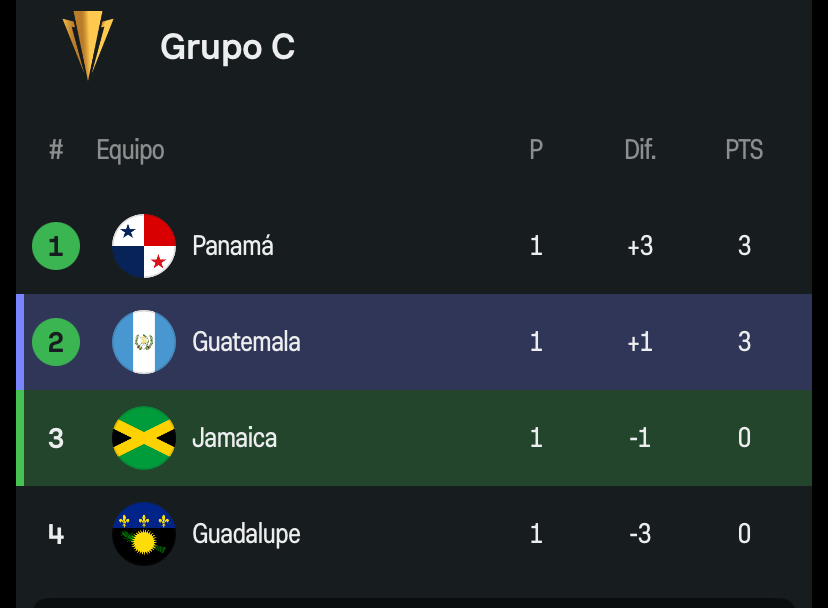 Con este resultado Guatemala se pone en el segundo lugar del Grupo con los mismos puntos de Panamá que venció a Guadalupe 5 goles contra 2, Guatemala salta de nuevo a las canchas el próximo viernes antes los Panameños a las 20:00 horas.