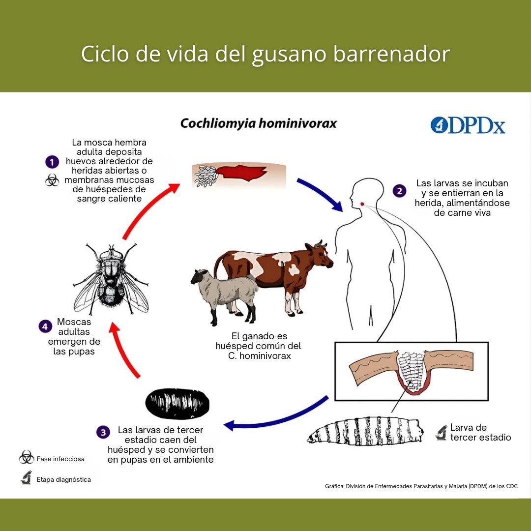 El gusano barrenador también afecta al ganado y mascotas. El Ministerio de Agricultura (MAGA) registro hasta la fecha más de 900 casos en animales en este año, con una campaña activa para el control. Además, se trabaja en colaboración con México y Estados Unidos para lanzar pronto una aplicación para reportar y monitorear infestaciones.