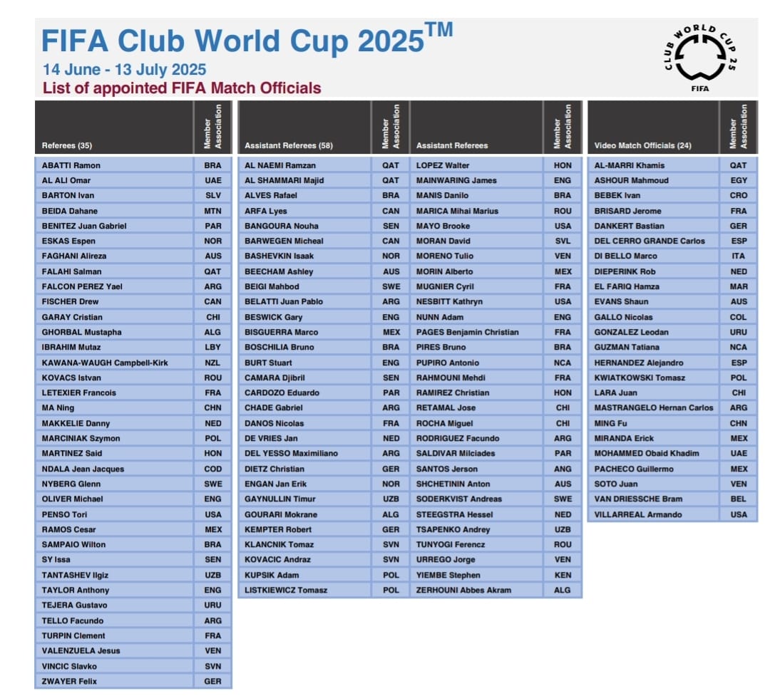 abril 14, 2025La Federación Internacional de Fútbol Asociación (FIFA), presentó el listado de árbitros que participarán en el Mundial de Clubes 2025 que se jugará en los Estados Unidos.