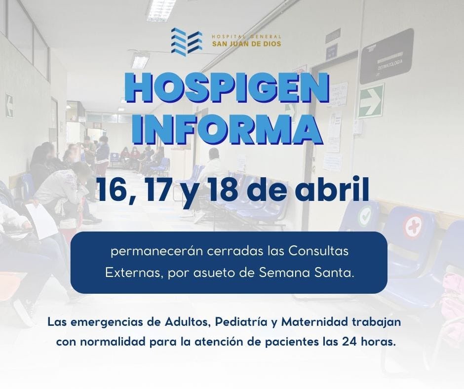 En una publicación en redes sociales, el Hospital General San Juan de Dios informó los días que estará cerrada la consulta general debido a la conmemoración de la semana mayor.
