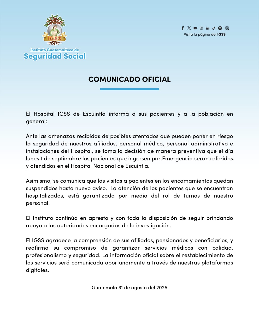 septiembre 1, 2025El Instituto Guatemalteco de Seguridad Social (IGSS) de Escuintla, dio a conocer a través de un comunicado que, a partir de hoy, todos los pacientes que lleguen al área de Emergencia, serán referidos al Hospital Nacional del mismo departamento.
