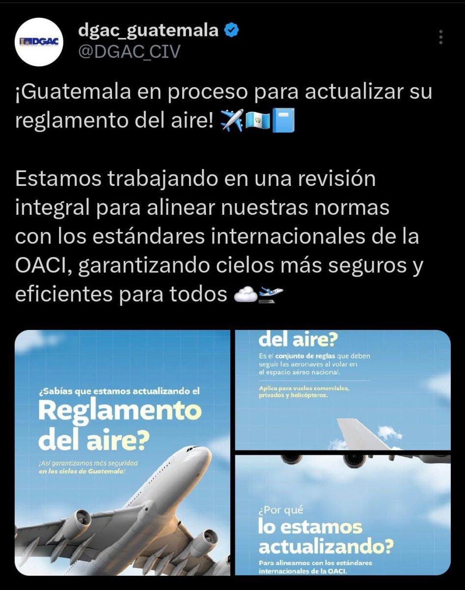 De acuerdo con los estándares internacionales, Guatemala a través de la Dirección de Aeronáutica Civil (DGAC), está desarrollando un proceso de actualización del Reglamento del Aire.