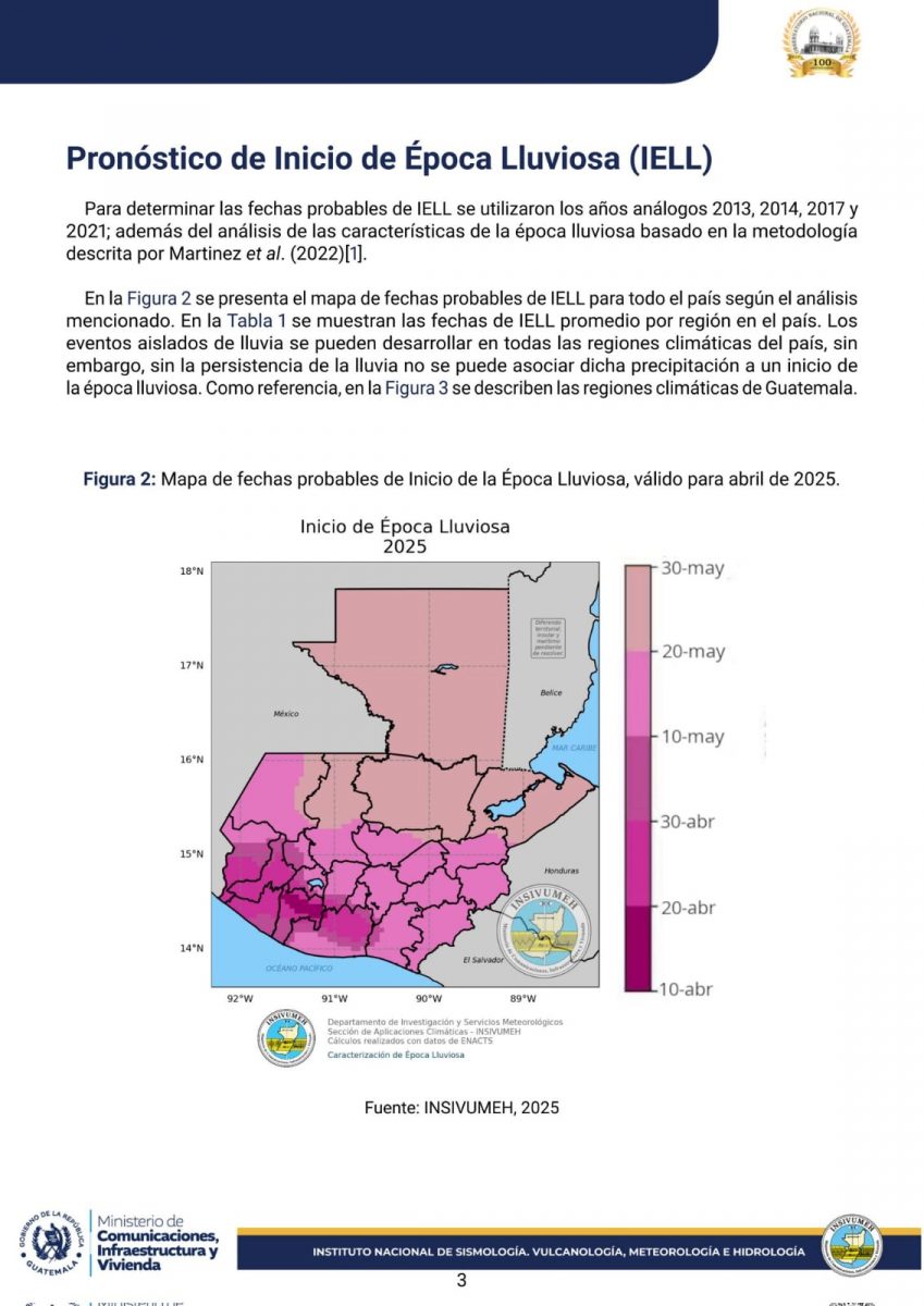 En la región de Bocacosta, se estima que las lluvias comiencen entre la segunda semana de abril y la primera semana de mayo. Para la región del Pacífico, el inicio podría darse entre la tercera semana de abril y la segunda semana de mayo.