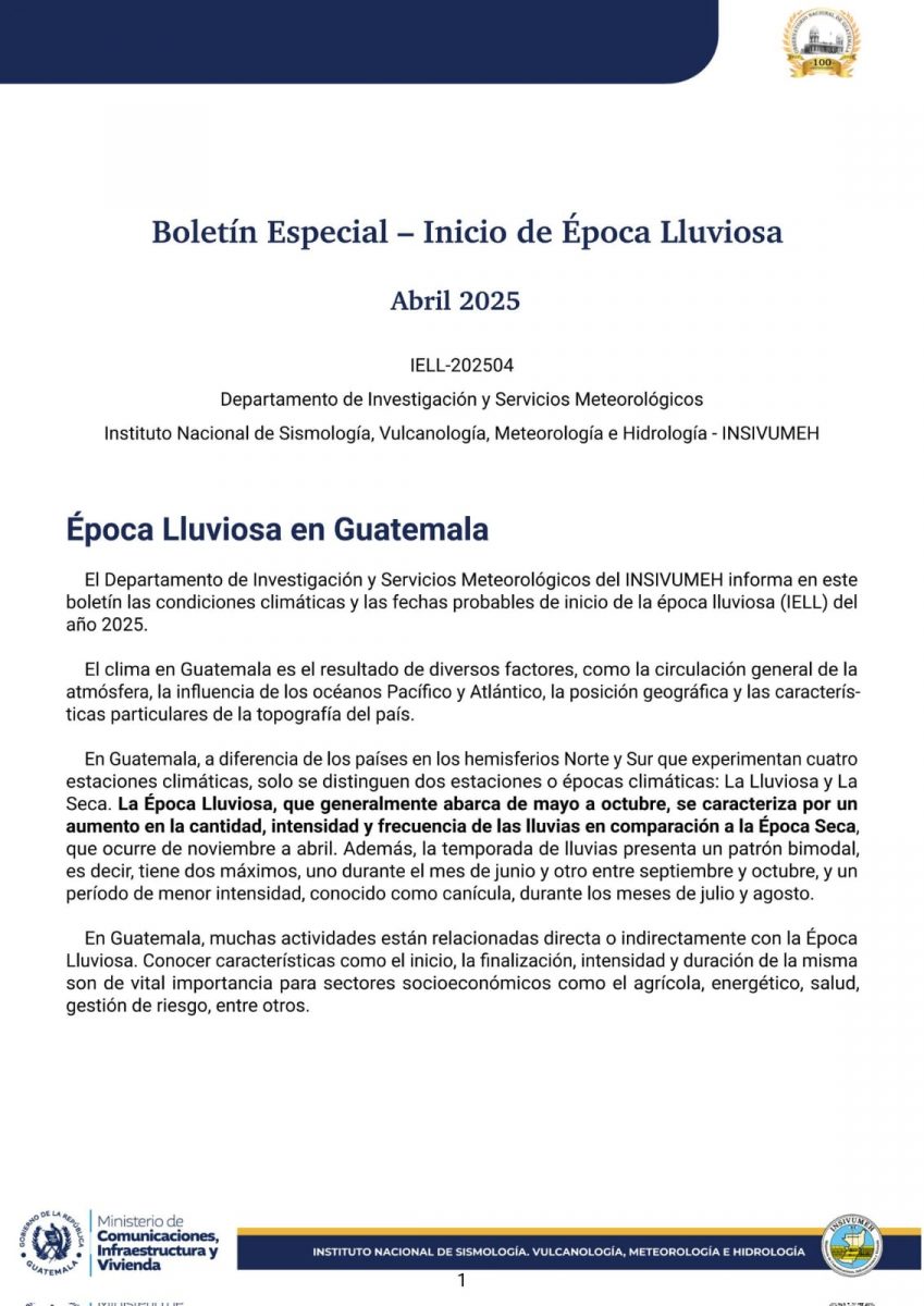 Según el Instituto Nacional de Sismología, Vulcanología, Meteorología e Hidrología (INSIVUMEH), se pronostica el inicio de la época lluviosa en el territorio nacional, la cual se caracteriza por el aumento significativo en la cantidad, intensidad y frecuencia de las precipitaciones.