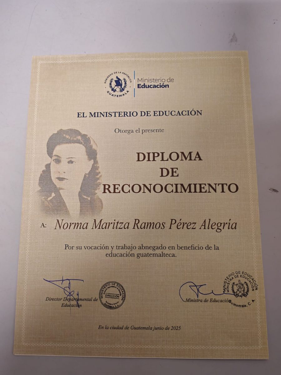 Para el mes en junio de 2025, se le otorgó la Mención Honorífica al Galardón “Profesora María Chinchilla”, uno de los reconocimientos más emblemáticos del magisterio nacional, en honor a su vocación, compromiso y trabajo abnegado en beneficio de la educación guatemalteca.