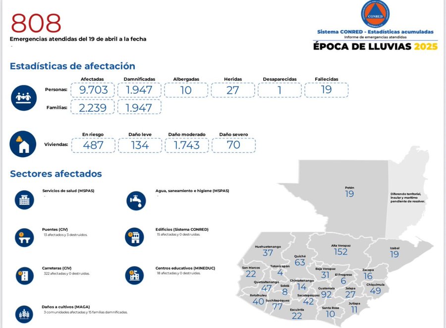 Según la Coordinadora Nacional para la Reducción de Desastres (CONRED), hasta el jueves 3 de julio se atendieron 808 emergencias relacionadas con la temporada de lluvias. «Hasta este jueves 3 de julio, 808 emergencias han sido atendidas,» mencionó la CONRED. El país sigue bajo monitoreo constante, mientras nuevas lluvias amenazan con provocar más incidentes.