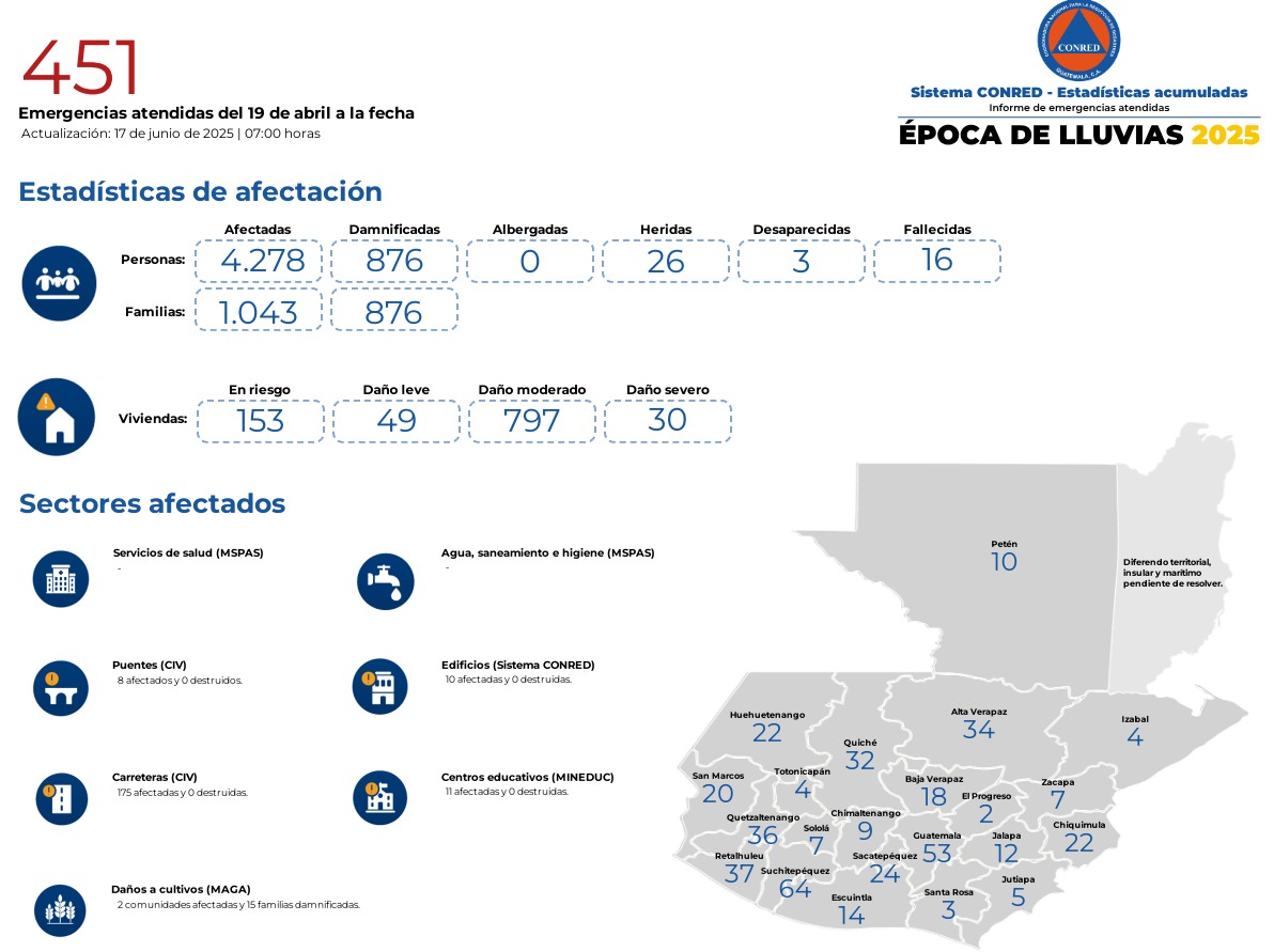 Según el último reporte oficial de la CONRED, 4,278 personas fueron afectadas, de las cuales 876 están damnificadas, y no se reportan personas albergadas. También se registran 26 personas heridas, 3 desaparecidas y 16 fallecidas.