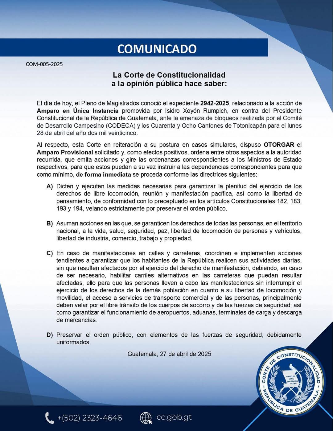 En el amparo provisional se ordena garantizar la movilidad. Fuente: Corte de Constitucionalidad..
