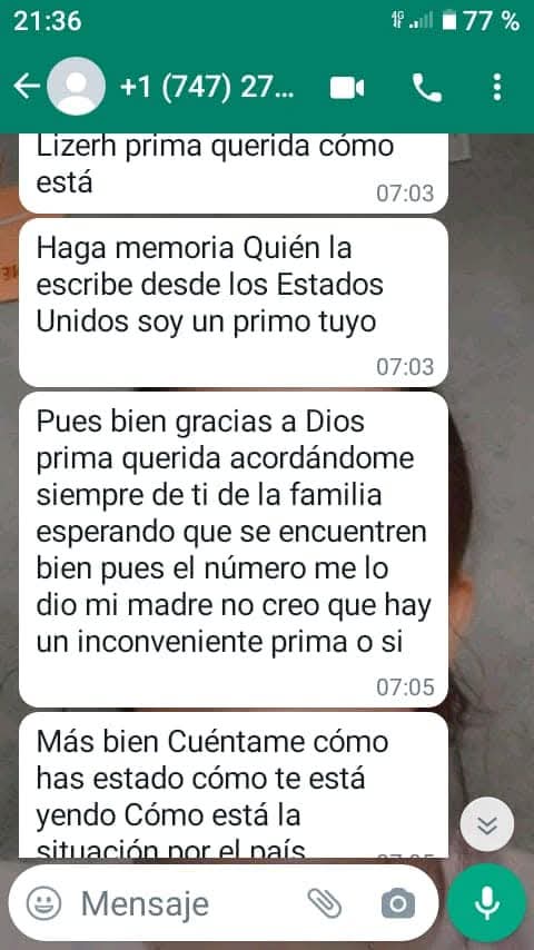 Familiares en el extranjero pidiendo ayuda, es una de las modalidades mayormente usada, «me escribió una supuesta prima, me pidio que le depositará para que le entregaran su equipaje», comentó, Luisa Aldana, quien hace 2 meses recibió los mensajes directamente a su número de celular. «Yo no tengo familiares en otro país», puntualizó, y por esa razón bloqueo de inmediato el número del que le habían escrito.