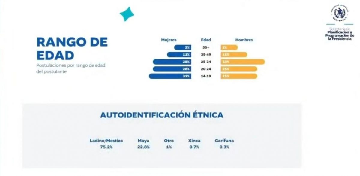 En cuanto al perfil de los solicitantes, Segeplan indicó que el 55 por ciento fueron mujeres y el 45 por ciento hombres. También se registró participación desde todos los departamentos del país, siendo Quiché, Guatemala, Chimaltenango, Sacatepéquez y Chiquimula los que reportaron mayor número de aplicaciones.