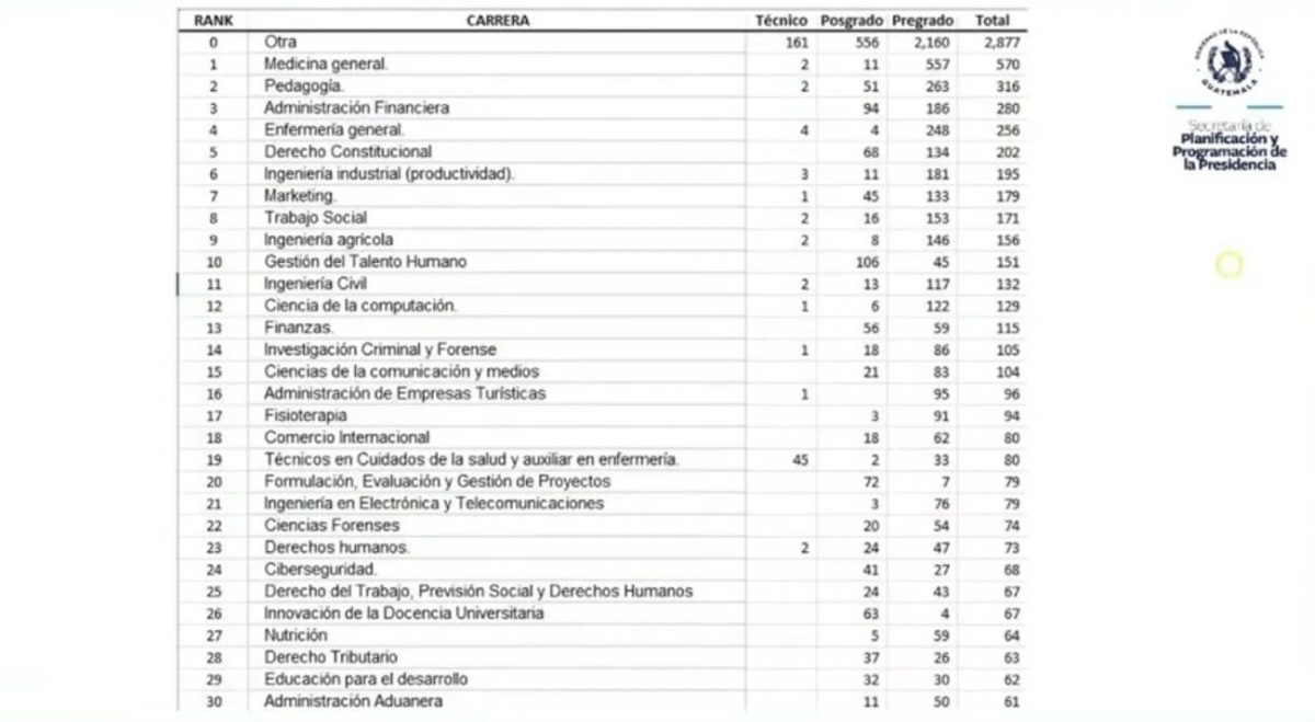 En conferencia de prensa, el secretario de Segeplan, Carlos Mendoza, informó que los aspirantes aplicaron a 188 carreras diferentes. “Este es el top 30 de carreras; la que tuvo más aplicaciones fue Medicina General, con casi 600 aplicaciones”, indicó.