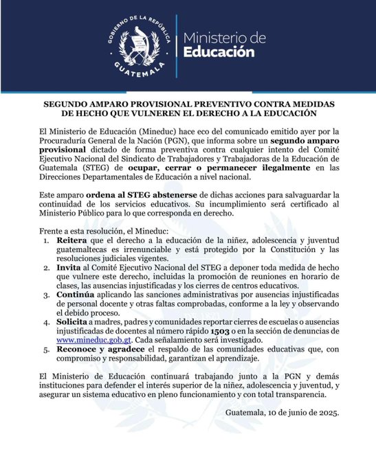 junio 11, 2025El Ministerio de Educación (MINEDUC) manifestó su respaldo al segundo amparo provisional preventivo otorgado por un juzgado, a solicitud de la Procuraduría General de la Nación (PGN), con el objetivo de evitar que el Sindicato de Trabajadores y Trabajadoras de la Educación de Guatemala (STEG) realice acciones que interfieran en el funcionamiento del sistema educativo nacional.