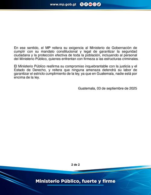 Según el MP, las amenazas ya han sido documentadas y están siendo investigadas como parte de un patrón de hostigamiento e intimidación dirigido a entorpecer el trabajo independiente de la institución. El ente aseguró que estos actos son parte de una serie de ataques sistemáticos contra su personal.