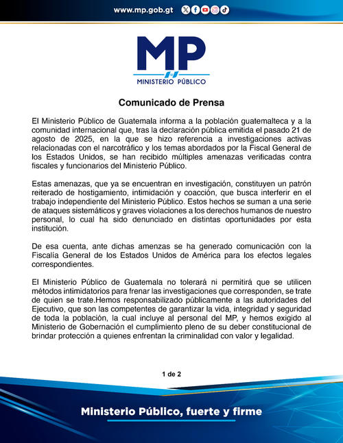 septiembre 5, 2025Fiscales y funcionarios del Ministerio Público (MP) han recibido amenazas directas, así lo informó el ente investigador el pasado miércoles. Esto derivado de que la fiscal general Consuelo Porras, revelara que se encuentran en curso investigaciones relacionadas con estructuras de narcotráfico que operan en el país.