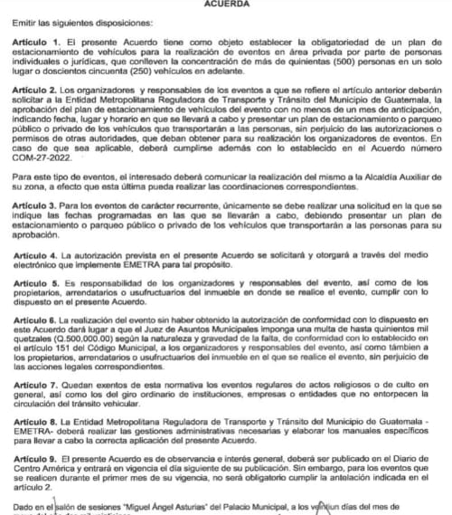 Este acuerdo fue publicado el pasado 27 de junio en el Diario de Centroamérica por lo que cobró vigencia un día después, en él se establece la obligatoriedad de un plan de estacionamiento de vehículos para la realización de eventos de más de 500 personas en un solo lugar.
