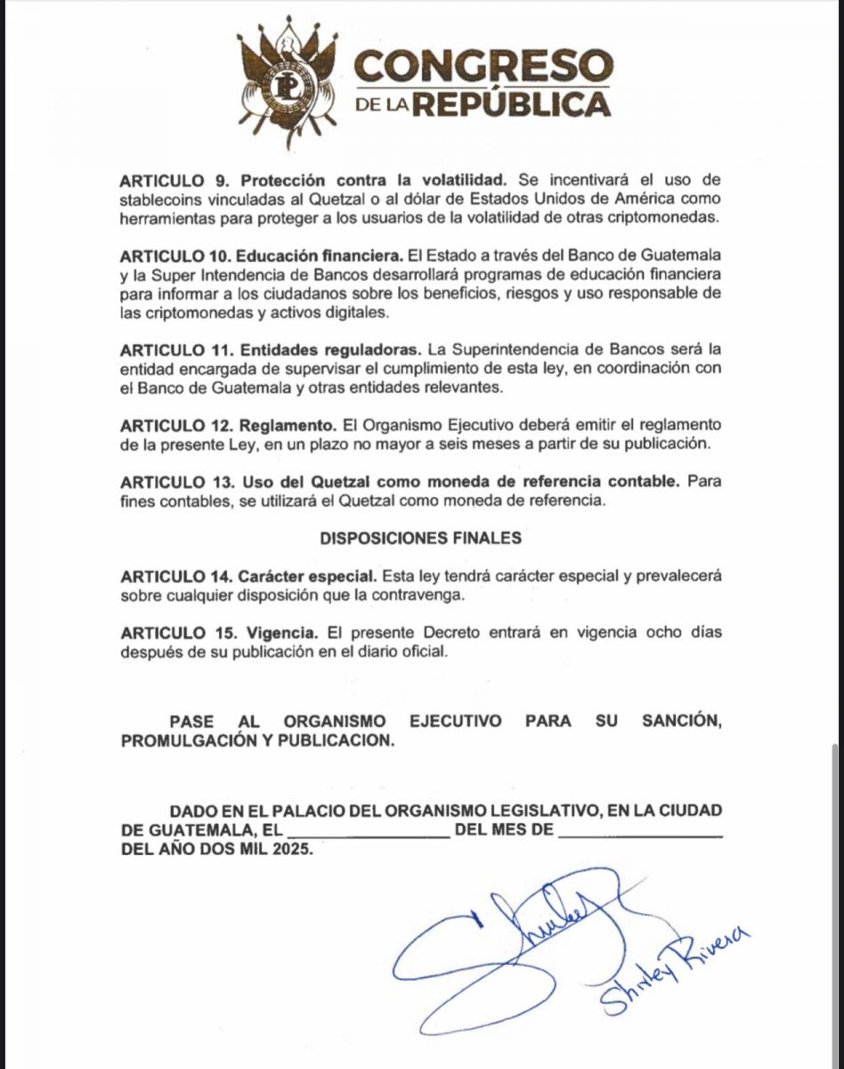 Fue presentada ante el Congreso de la República, orientada a regular el uso, intercambio y almacenamiento de criptomonedas en el país. El proyecto busca sentar las bases legales para la utilización de activos digitales como parte del ecosistema financiero guatemalteco, sin otorgarles el estatus de moneda de curso legal.