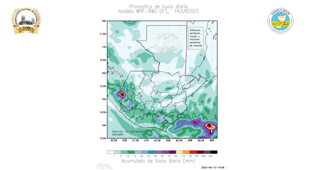 Según el reporte emitido del INSIVUMEH, las precipitaciones serán más intensas en las tardes y noches del sábado 14 y domingo 15, en regiones del sur al centro del país. Las zonas con mayor riesgo de acumulados de lluvia son el Suroccidente, Boca Costa, el Altiplano Central y los Valles del Oriente.