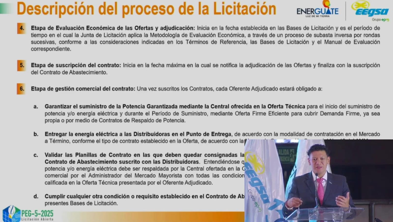 Mario Naranjo, gerente general de EEGSA, destacó que se busca contratar 1,400 MW en un proceso abierto a todas las tecnologías y con reglas claras para atraer a inversionistas nacionales e internacionales. Las bases estarán disponibles desde el 23 de abril por un costo de USD$10,000, y se realizará una reunión informativa para resolver dudas.