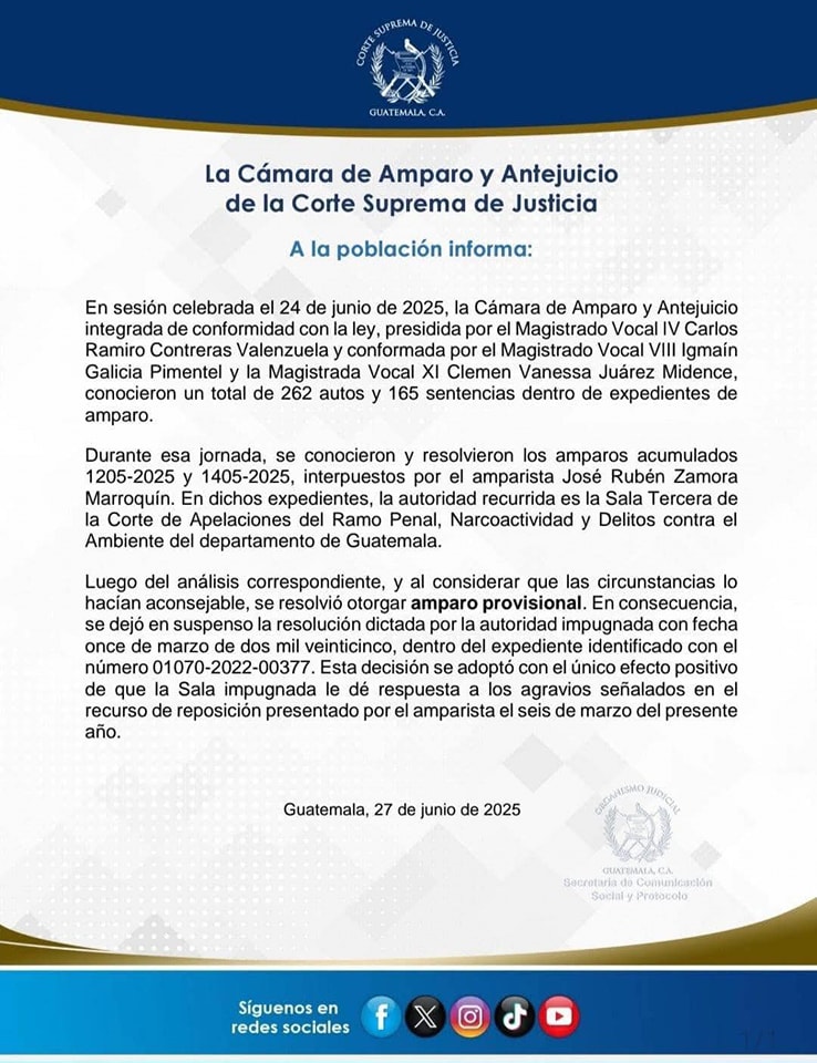 julio 1, 2025La Cámara de Amparo y Antejuicios de la Corte Suprema de Justicia (CSJ) otorgó un amparo provisional al periodista José Rubén Zamora Marroquín, suspendiendo temporalmente la resolución que ordenaba su retorno a prisión preventiva desde el 11 de marzo de 2025 . La decisión fue tomada por el Magistrado Vocal IV, Carlos Ramiro Contreras Valenzuela, junto a los magistrados Igmaín Galicia Pimentel y Clemen Vanessa Juárez Midence, en sesión donde se conocieron los expedientes acumulados 1205-2025 y 1405-2025.