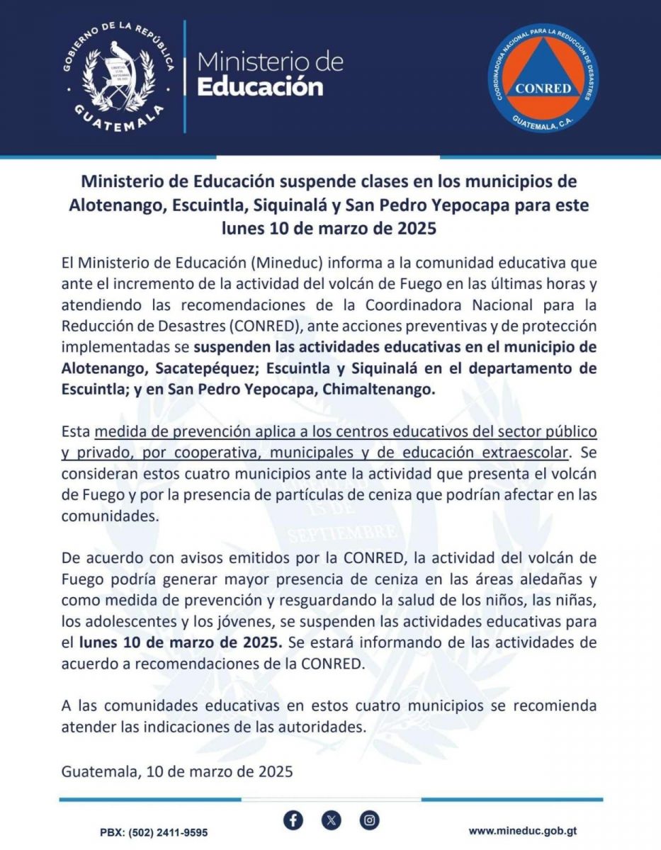 Como medida de prevención y para seguridad de estudiantes y profesores, el Ministerio de Educación suspendió las clases este lunes 10 de marzo en los municipios de Alotenango, Sacatepéquez, Escuintla, y Siquinalá en el departamento de Escuintla; y en San pedro Yepocapa, Chimaltenango.