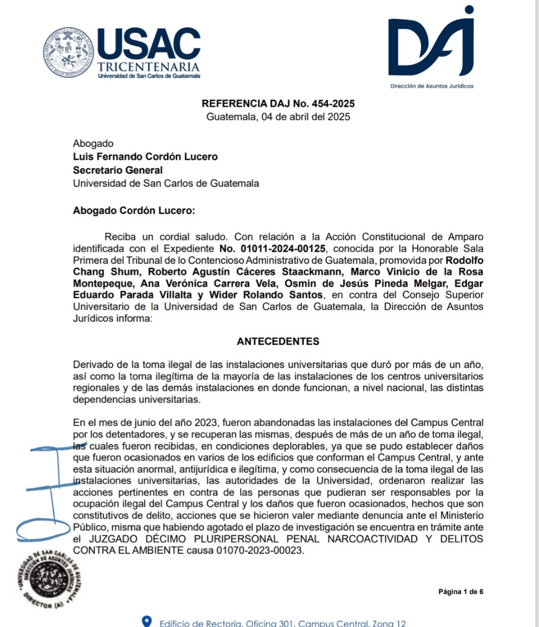 La Dirección de Asuntos Jurídicos de la USAC argumenta que la sentencia de la Corte de Constitucionalidad, emitida el 13 de febrero de 2025, no puede ejecutarse aún, ya que está pendiente la resolución de un memorial que presentaron el 12 de marzo del mismo año. Según la USAC, este trámite es clave para conocer los alcances reales de la sentencia.