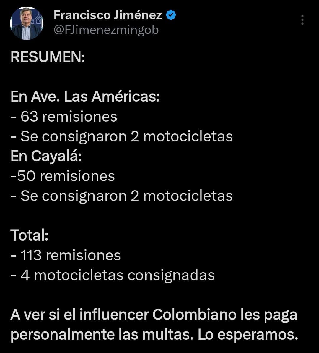 El ministro de Gobernación indicó que al creador de contenido se le vinculó de instigar a los motociclistas al desorden público, obstaculización de vías y daño a la propiedad pública. “a ver si el influencer colombiano les paga personalmente las multas. Lo esperamos”, puntualizó Jiménez en sus redes sociales.