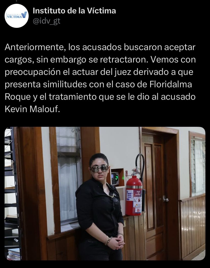 Respecto al rechazo de la recusación del Instituto de la Víctima, se emitió varios comunicados en la red social institucional, haciendo ver la preocupación en el actuar de Regado, comparándolo con el caso de Floridalma Roque.