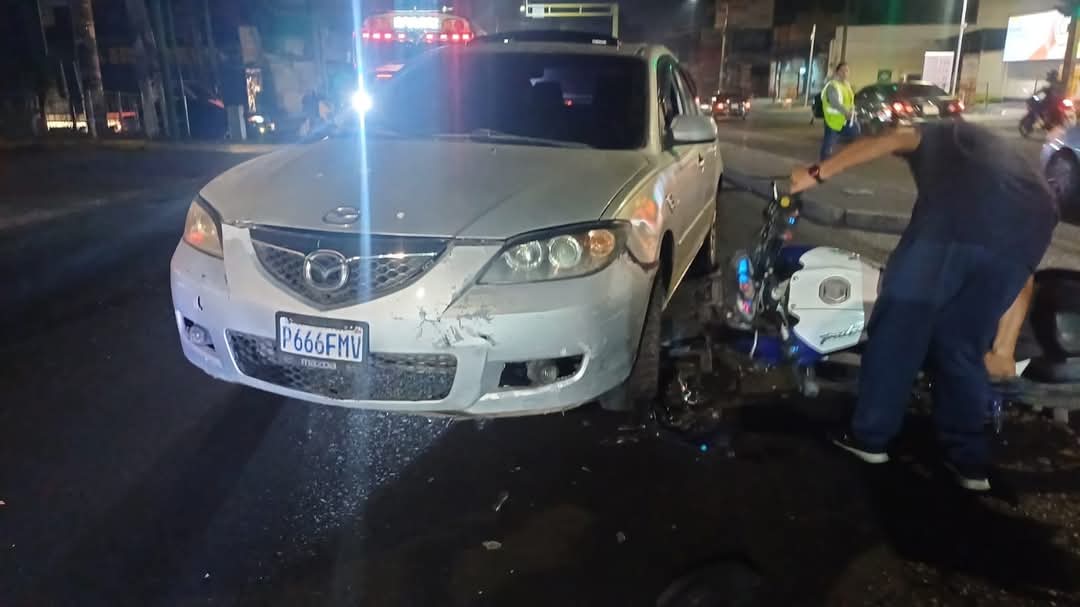 Accidente entre un automóvil y un motorista en la 10ma Avenida, Calzada San Juan. Unidad de emergencia brinda asistencia en el lugar. Informa PMT de Mixco.