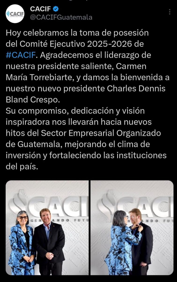 “Su compromiso, dedicación y visión inspiradora nos llevarán hacia nuevos hitos del Sector Empresarial Organizado de Guatemala, mejorando el clima de inversión y fortaleciendo las instituciones del país”, indicó un comunicado en redes sociales de la página del Cacif.
