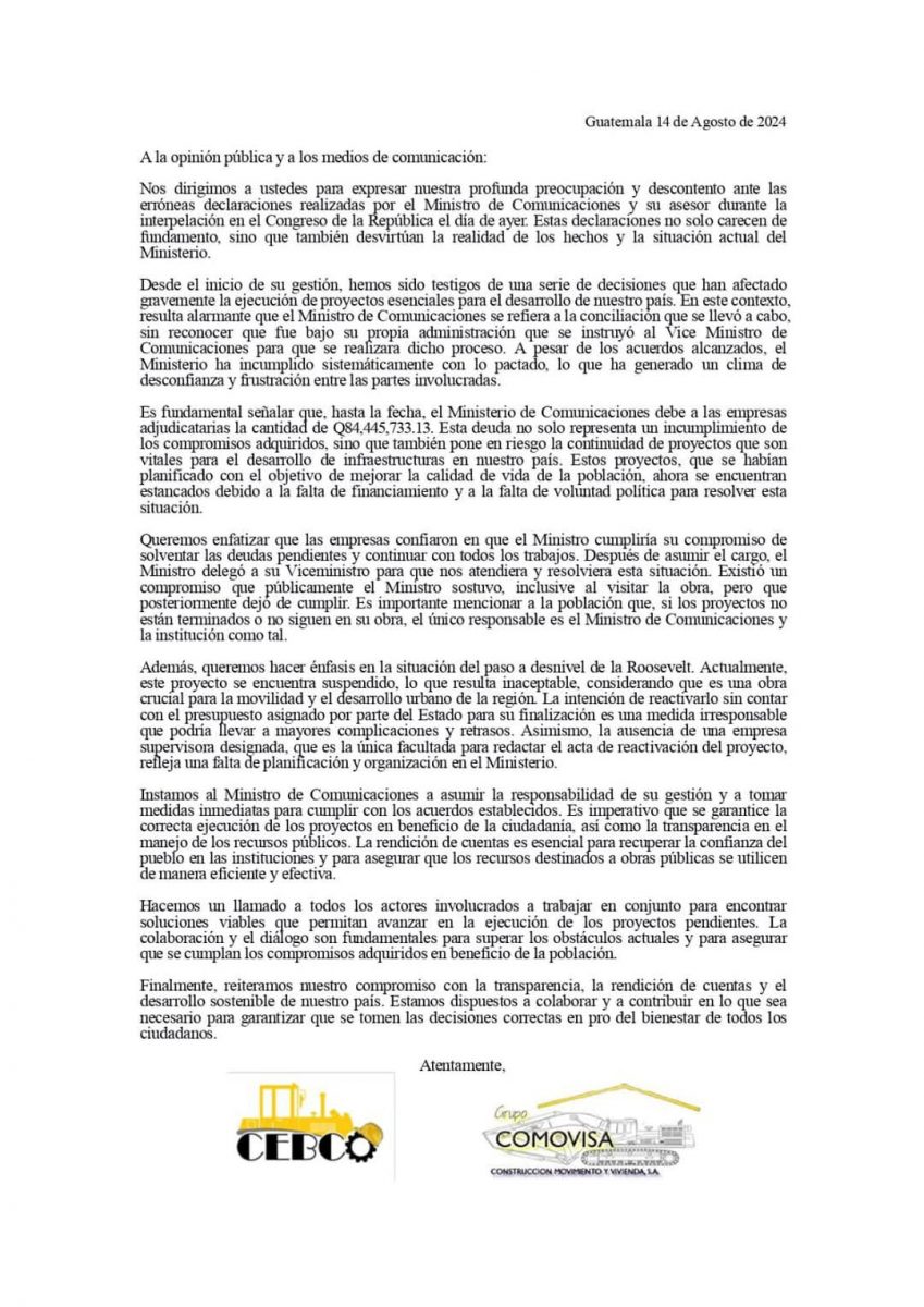 La suspensión del paso a desnivel Roosevelt estuvo marcada por señalamientos de parte de empresas contratistas. En agosto de 2024, los consorcios CEBCO y COMOVISA emitieron un comunicado público en el que cuestionaban el manejo del proyecto por parte del Ministerio. Afirmaron que la obra había sido detenida sin garantizar los recursos necesarios para su finalización y señalaron una deuda pendiente por más de Q84 millones con distintas empresas adjudicatarias.