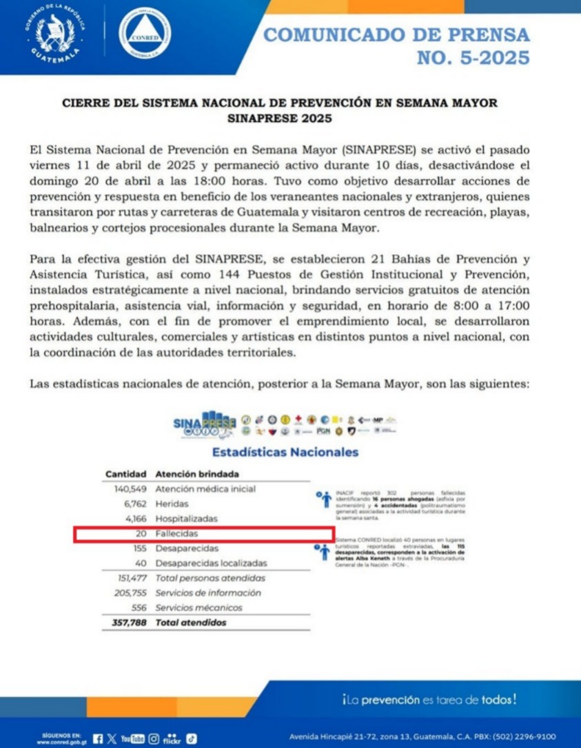 El Sistema Nacional de Prevención en Semana Mayor (SINAPRESE) contabilizó un total de 20 personas fallecidas por emergencias durante la Semana Santa, la mayoría por ahogamiento, además de otras 4 mil 166 que fueron hospitalizadas por diversos motivos, según confirmaron las fuentes oficiales.
