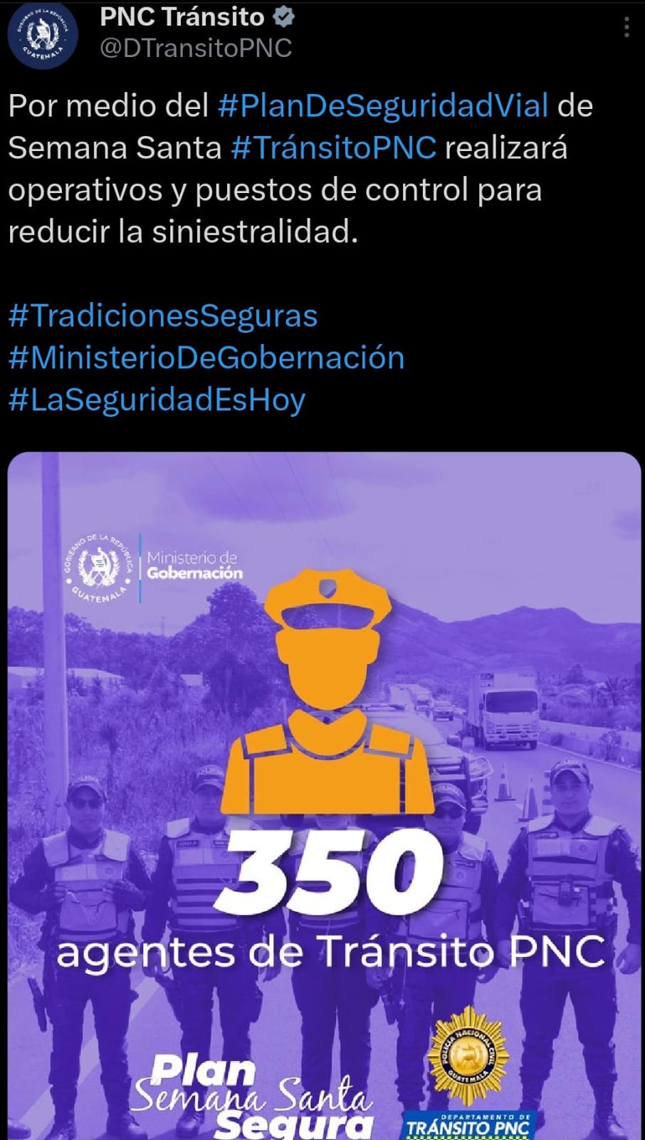 También cuenta con un total de 350 agentes de la PNC, los cuales ayudarán al monitoreo y la atención de estas emergencias, mismo que se mantendrán alerta las 24 horas del día ante eventualidades en las rutas asignadas.