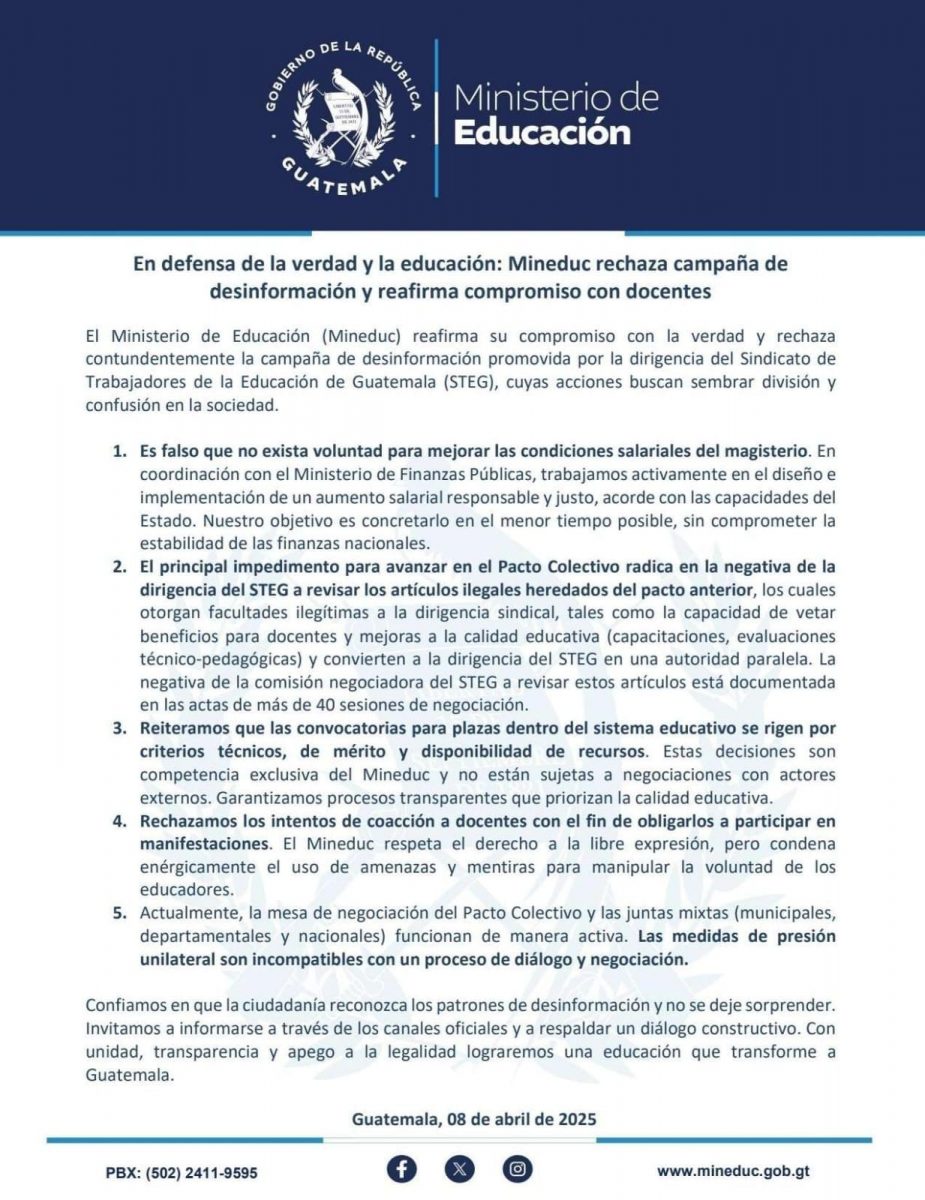 El 8 de abril, el Mineduc emitió un comunicado rechazando lo que considera una campaña de desinformación promovida por la dirigencia del STEG. La institución aseguró que sí existe voluntad para mejorar las condiciones salariales del magisterio, y que junto al Ministerio de Finanzas trabaja en una propuesta de aumento responsable con las capacidades del Estado.