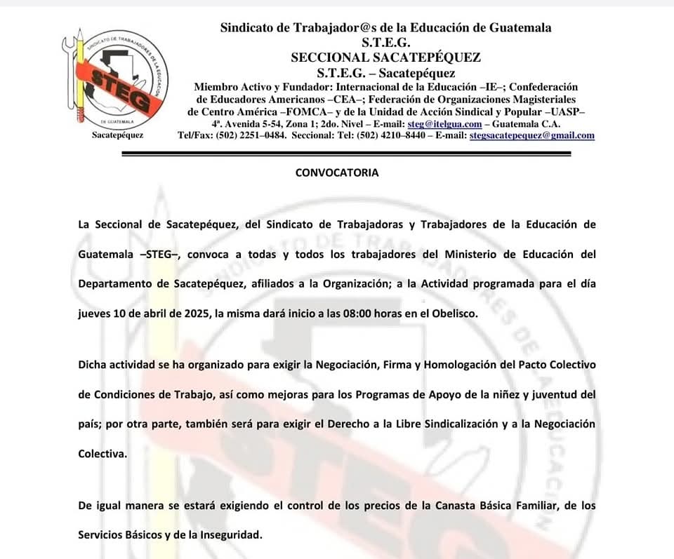 La Seccional de Sacatepéquez del STEG convocó a una manifestación para el jueves 10 de abril, a partir de las 08:00 horas en el Obelisco. Los objetivos de la movilización incluyen exigir la negociación, firma y homologación del Pacto Colectivo, mejoras en programas de apoyo para la niñez y juventud, el respeto al derecho de libre sindicalización y negociación colectiva, y medidas para controlar los precios de la canasta básica y servicios esenciales.
