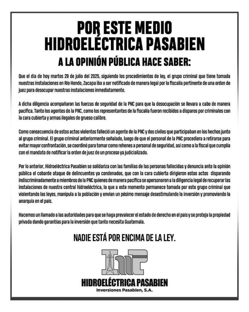 La empresa hidroeléctrica, en un comunicado, señaló que “los agentes de la PNC, como los representantes de la fiscalía, fueron recibidos a disparos por criminales con la cara cubierta y armas ilegales de grueso calibre”. Agregó que tras el repliegue policial, “el grupo criminal… se coordinó para tomar como rehenes a personal de seguridad, así como a la fiscal que cumplía con el mandato de notificar la orden de juez”.