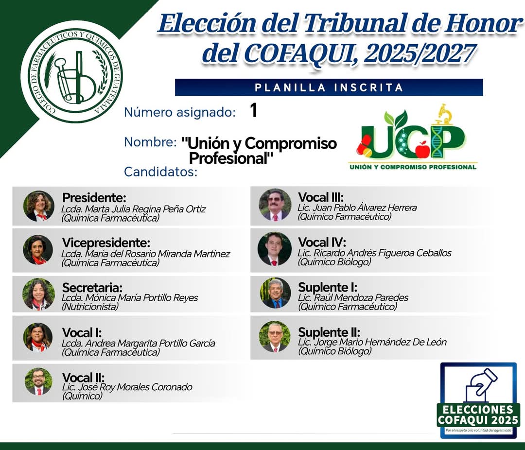 mayo 22, 2025La planilla #1 Unión y Compromiso Profesional (UGP) es la ganadora del proceso electoral de Junta Directiva y Tribunal de Honor del Colegio de Farmacéuticos y Químicos de Guatemala (COFAQUI), dicho proceso tuvo lugar en la sede ubicada en zona 15.