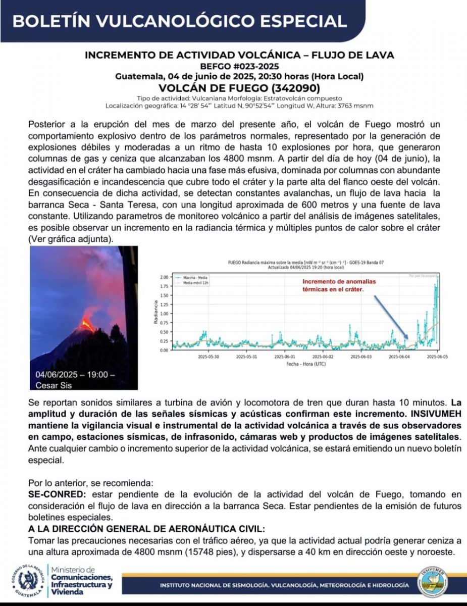 «La amplitud y duración de las señales sísmicas y acústicas confirman este incremento», se lee en el boletín. También hicieron saber que el Instituto de Sismología, Vulcanología, Meteorología e Hidrología (INSIVUMEH), mantiene la vigilancia visual e instrumental de la actividad volcánica a través de sus observadores en campo, estaciones sísmicas, de infrasonido, cámaras web y productos de imágenes satelitales.